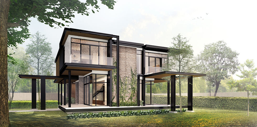 The modern industrial style house. The owners are two young ladies who would like to separate themselves from the main house and to grow the individual interesting difference from their parents. The first-floor plan layout is located in the common area to share the main facility, and the 2nd floor is separated to be two wings which each owner has her room and individual environment.